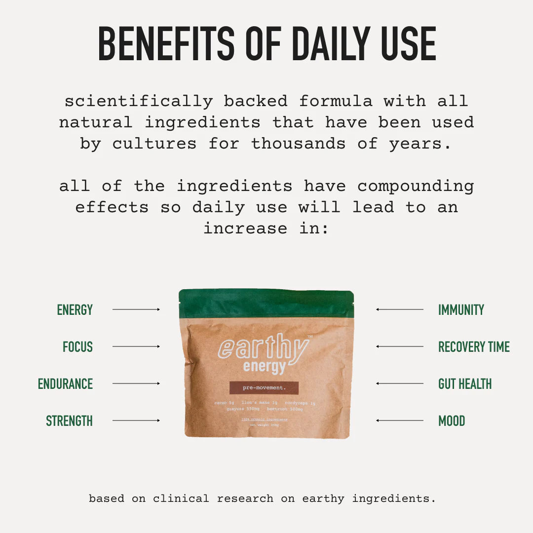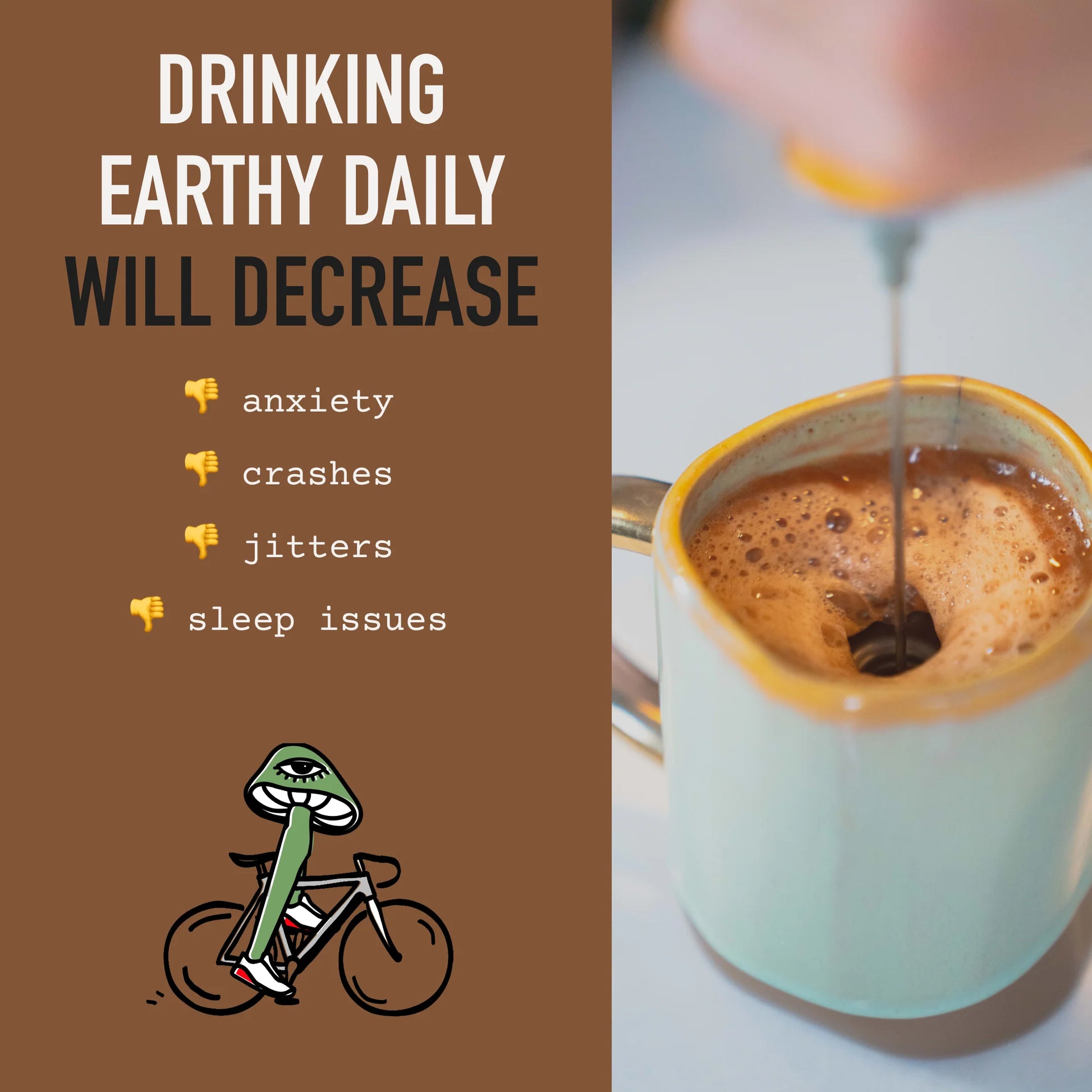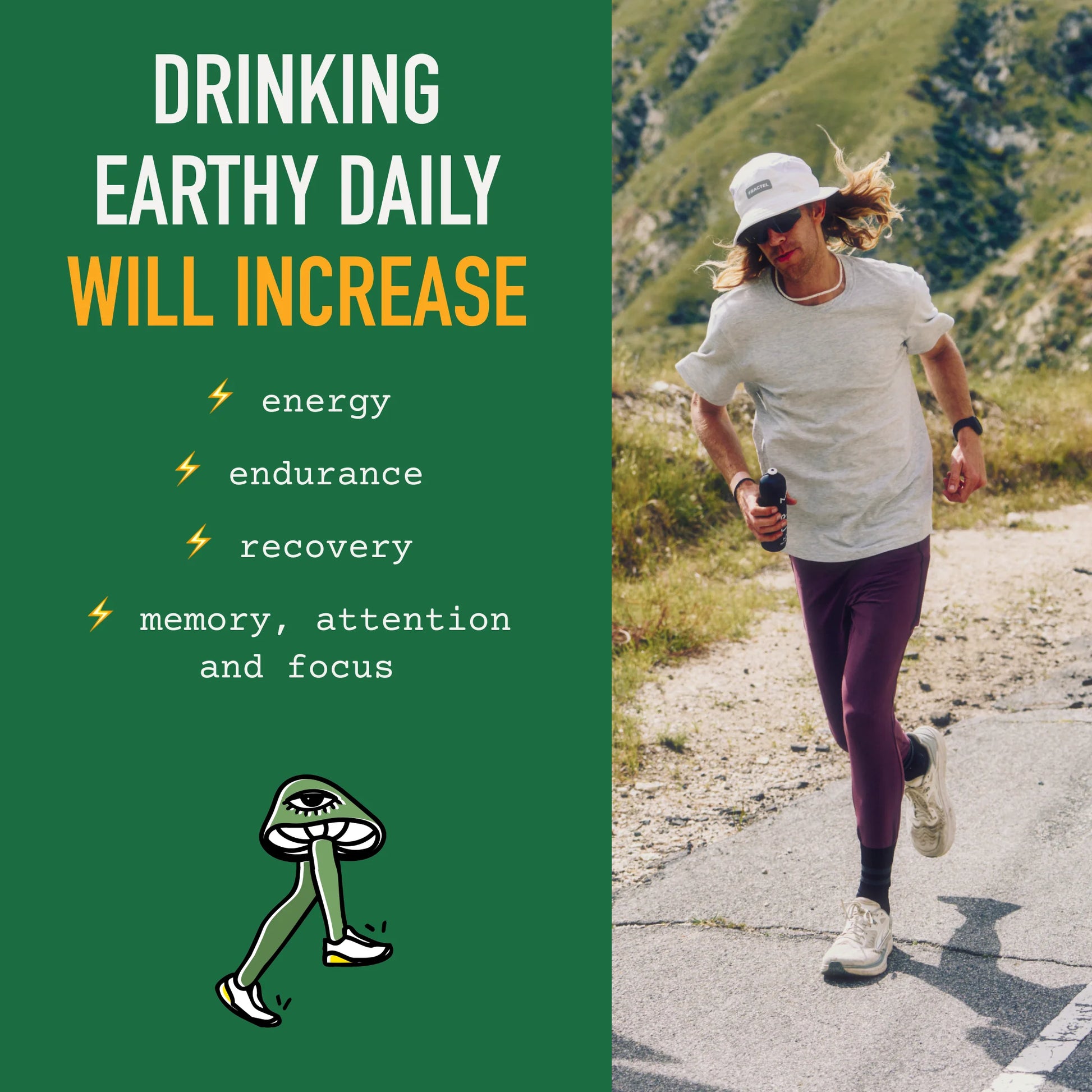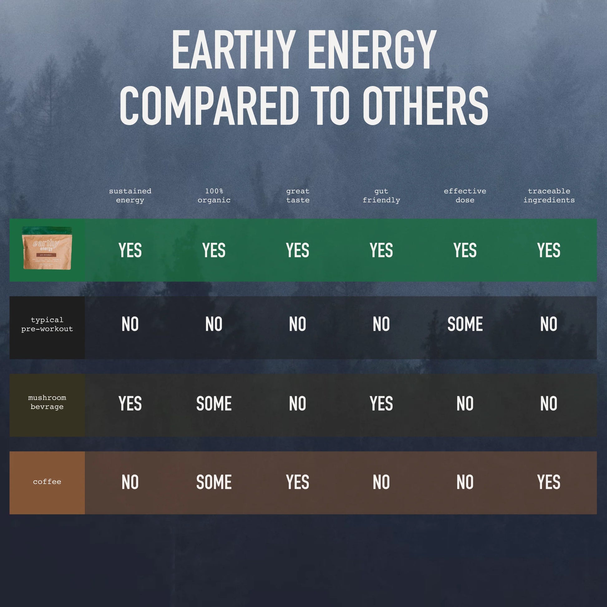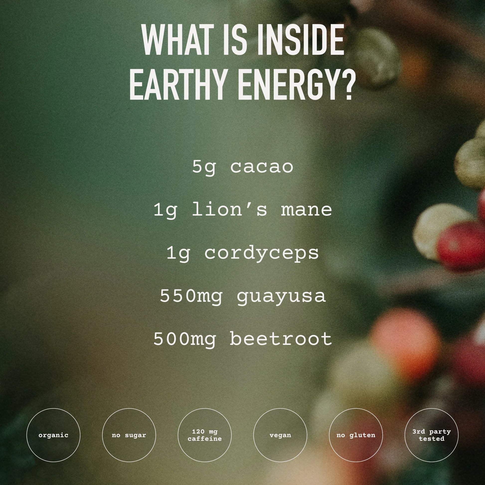 earthy energy is more than just caffeine. our functional mushrooms work to increase mental and physical performance, while the other ingredients provide your body with essential antioxidants and a cardiovascular boost.