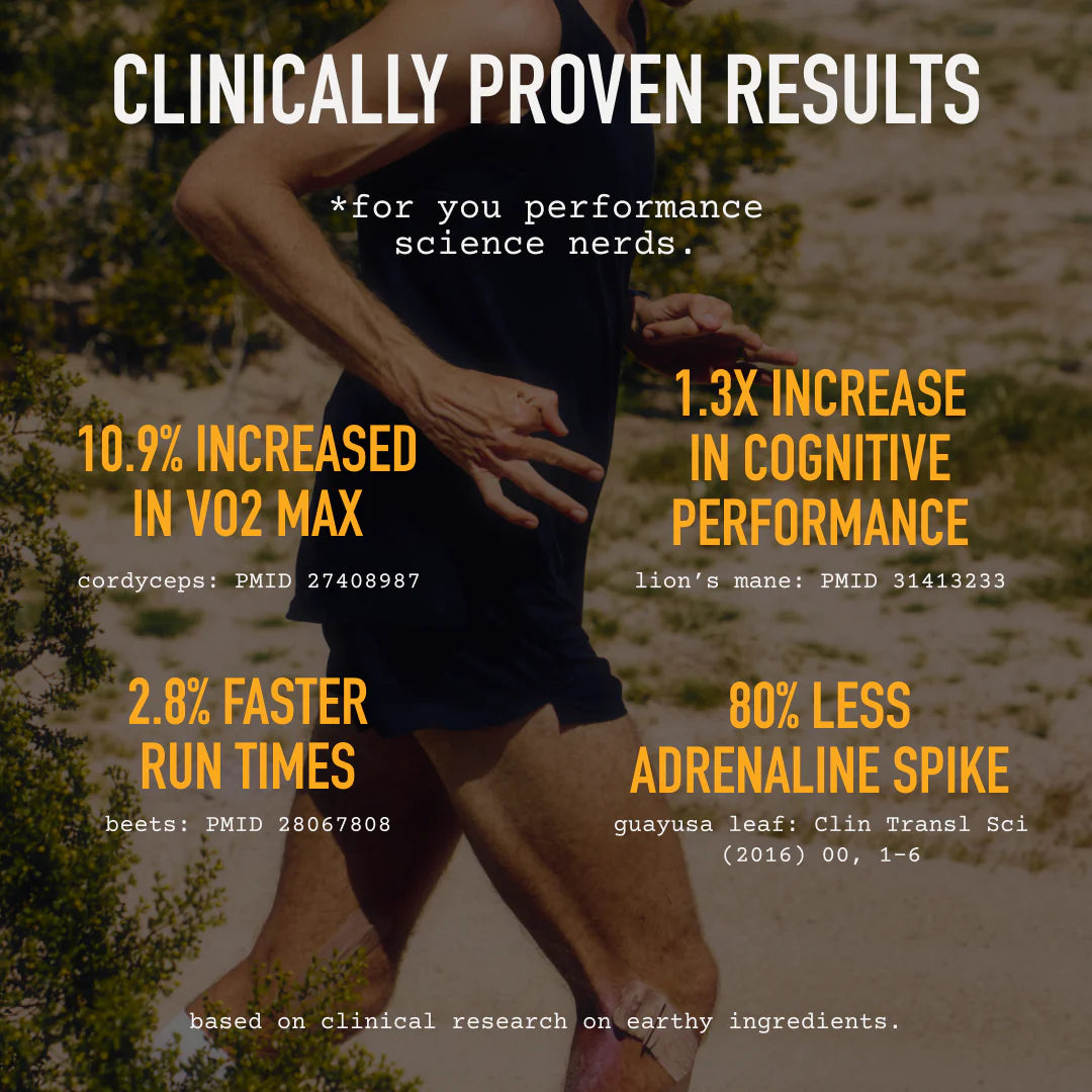 100% organic, science backed, and transparent ingredients to give smooth energy, focus and endurance without jitters, crash or sketchy ingredients.